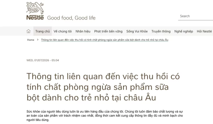 Thông tin về Nestlé thu hồi không chỉ được công bố trên website chính thức của Nestlé Việt Nam mà còn được các cơ quan báo chí lớn như VnExpress và Tuổi Trẻ đăng tải. Theo nội dung thông báo, doanh nghiệp triển khai đợt thu hồi tự nguyện mang tính chủ động phòng ngừa, đồng thời đồng hành cùng Bộ Y tế và các cơ quan chức năng trong quá trình rà soát, đảm bảo việc thực hiện đúng quy định và minh bạch thông tin tới người tiêu dùng.